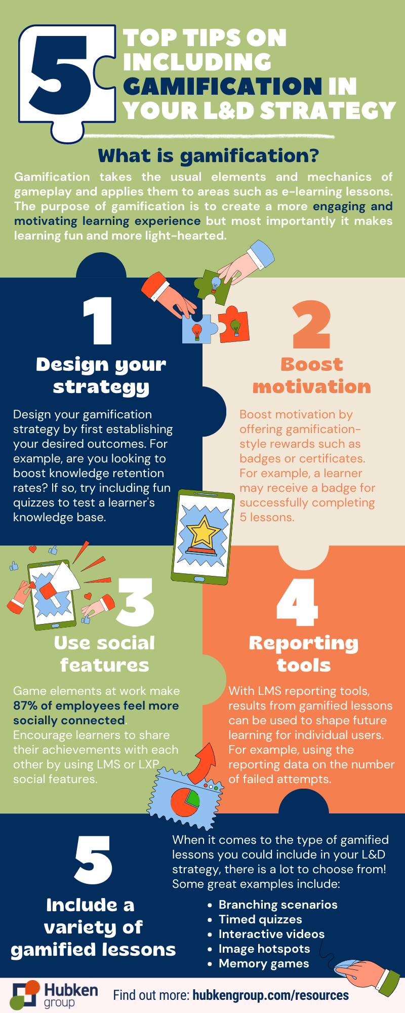 To help you get up to speed with how to go about including gamification in your L&D strategy, we've turned one of our popular gamification blogs into a handy infographic - keep scrolling to view it and be sure to keep reading for further insights on these top tips below.